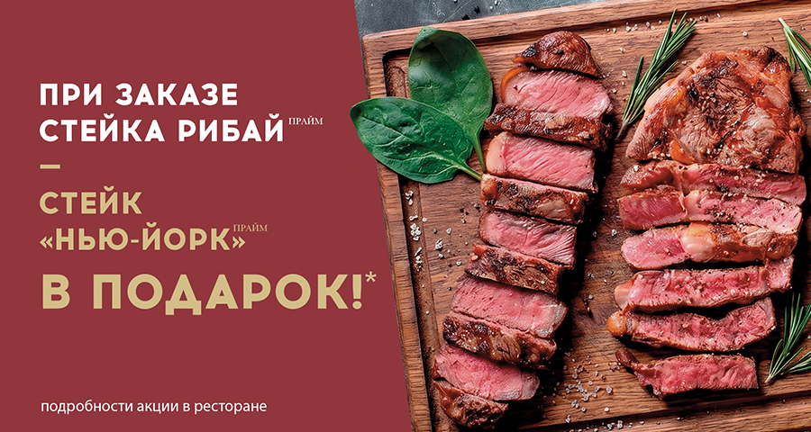 Отличный повод заглянуть в Гудман: при заказе Рибай прайм — стейк «Нью-Йорк» прайм в подарок.